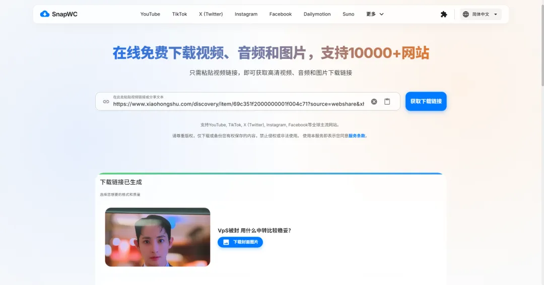不用登录、免费没有广告,一键就能下载视频、音频、图片,支持全球 10000 + 网站