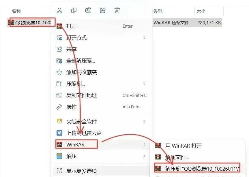 1.打开下载的浏览器安装包,鼠标右击压缩包【解压到QQ浏览器】。