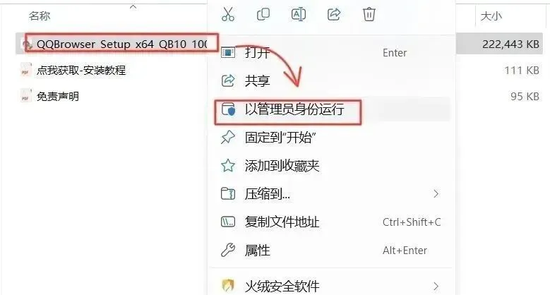 3.打开解压后的文件夹,鼠标右击【QQBrowser….exe】,选择【以管理员身份运行】(这步很重要!不然可能安装失败)。