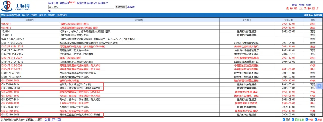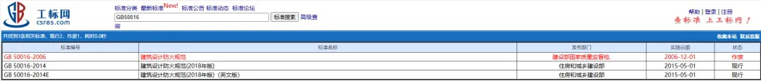 1、可通过该网站查询标准是否现行,输入标准号即可查询,如输入”GB50016″,点击标准搜索,可显示出该标准号的所有标准,包括作废、现行的所有标准,如下图。
