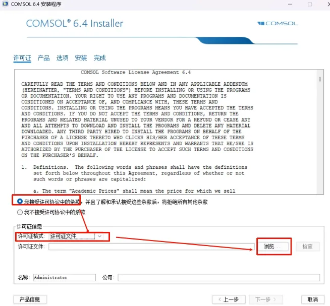 4、勾选我接受,选择许可证格式为【许可证文件】,点击“浏览”