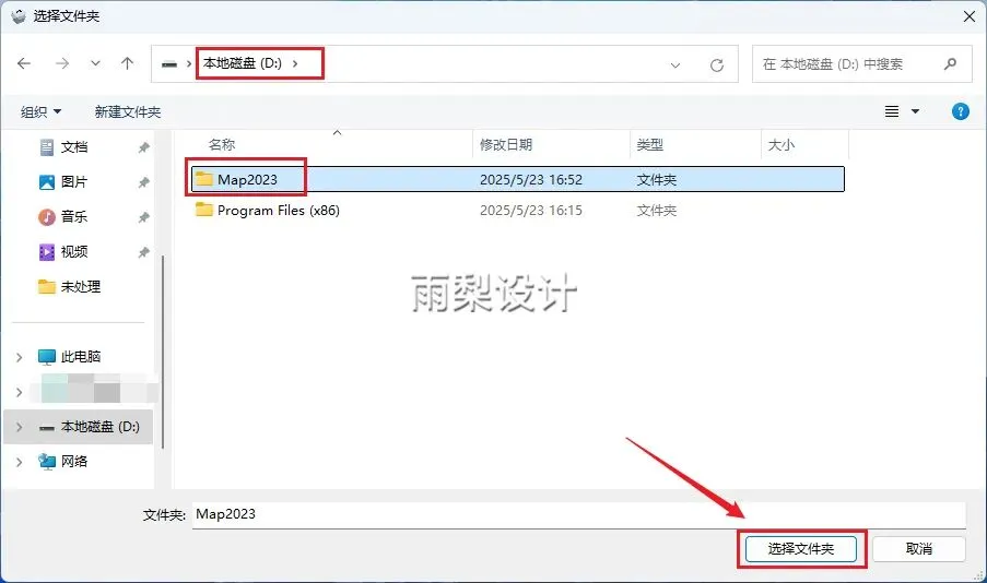 6.选择【D盘】,新建文件夹(名称不能是中文),点击【选择文件夹】