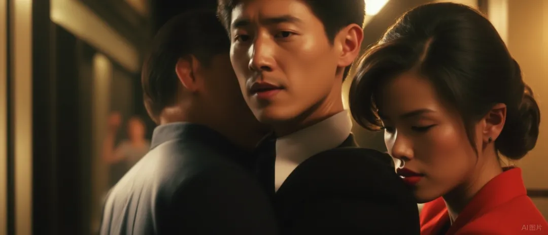 △大哥大嫂二姐三人正在家里吃饭,举杯庆祝二姐拿到美国签证,大哥身穿中山装,二姐身穿大红色连衣裙,大嫂内穿淡粉色孕妇装,外穿白色开衫,已有好几个月身孕。