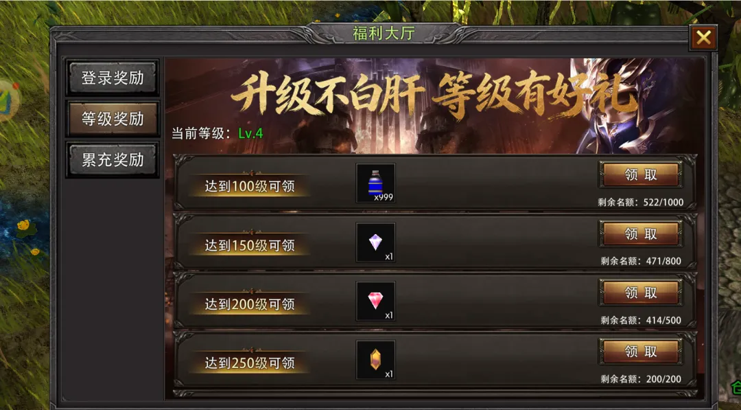 活动开启前7天,角色等级达到指定要求,即可领取绑定钻石、技能书、卓越武器碎片等奖励;等级排名进入前100名,可获得专属荣耀称号与高阶养成材料;排名跻身前10名,更能获取绝版传说坐骑。