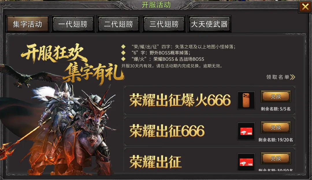 通过日常刷怪、完成日常任务可掉落“奇、迹、荣、耀”字样卡片,集齐对应卡片,可兑换祝福宝石、灵魂宝石、玛雅之石、二代翅膀等核心养成材料。