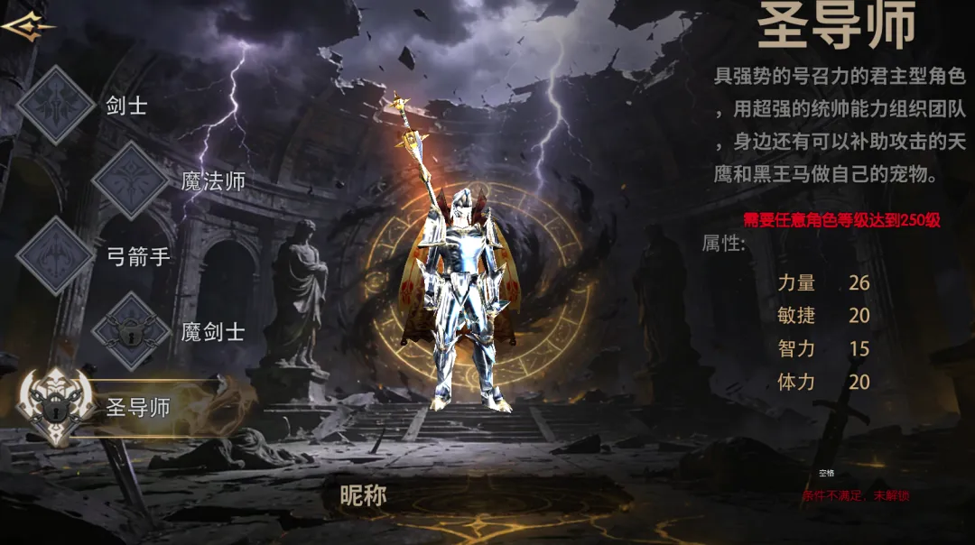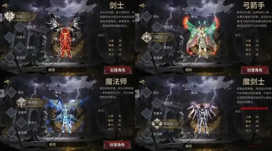 – 魔剑士、圣导师:属于进阶类职业,需要完成解锁条件,是团战、攻城玩法中的核心角色,单人作战能力相对较弱。