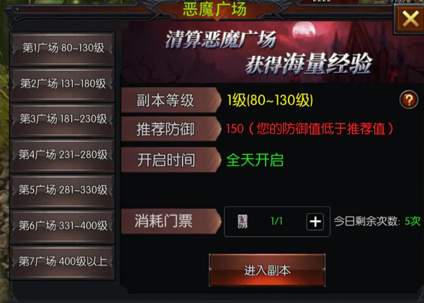 开服前3天,参与恶魔广场副本,可享受经验获取、道具掉落双重翻倍效果,大幅提升刷怪打宝效率。