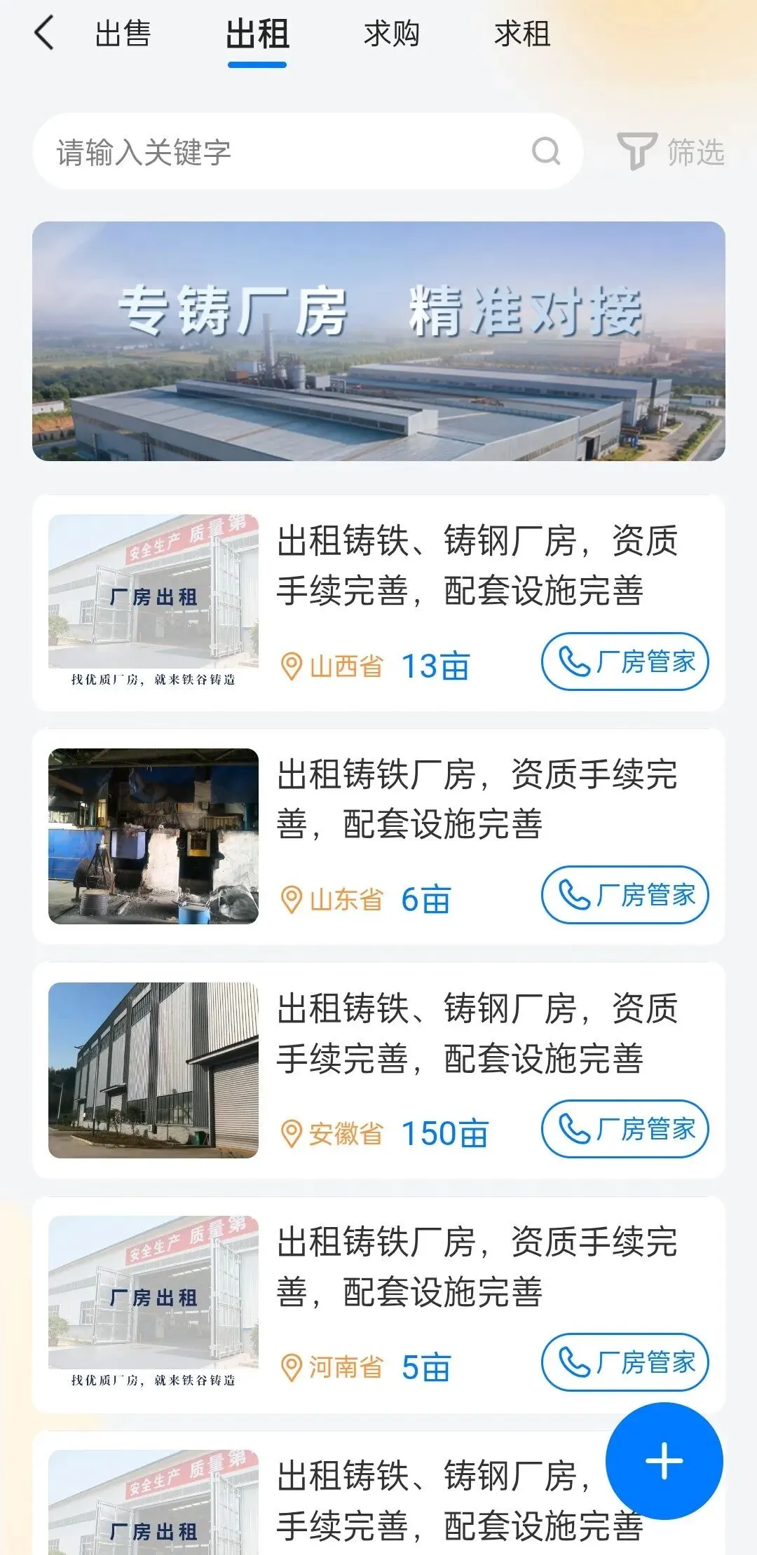 厂房出租找不到租客?找厂房翻遍朋友圈?铁谷铸造APP来了——铸造行业专属的厂房租售平台,实时更新,精准对接。
