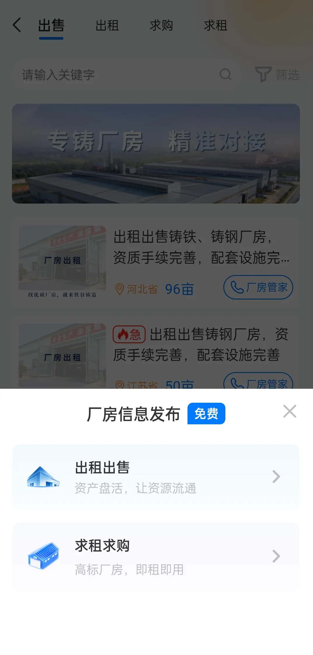 ✅ 我要出租厂房 → 免费发布,精准推送给找厂房的铸造厂老板✅ 我要求租厂房 → 海量厂房,按地区/面积/设施一键筛选✅ 我要出售厂房 → 快速挂牌,行业买家直达✅ 我要求购厂房 → 实时推送,不错过心仪厂房