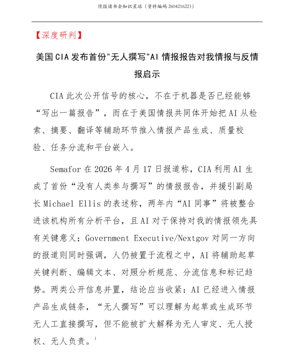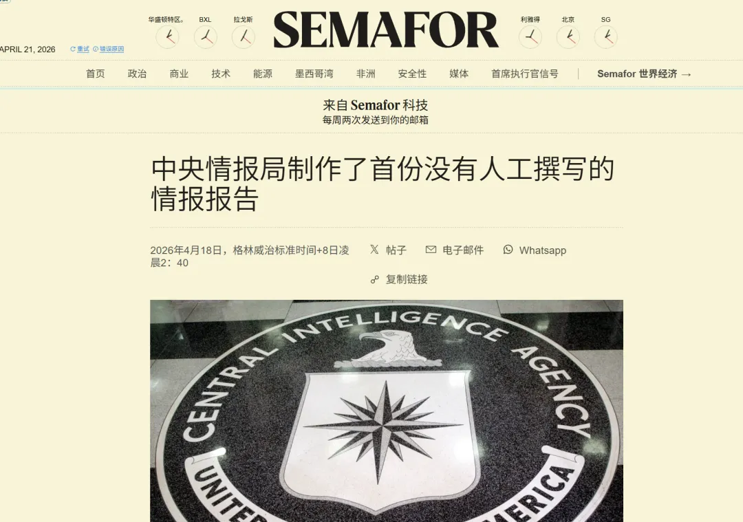 公开可查的报道里,Semafor在2026年4月18日披露,CIA使用AI创建了第一份“没有人类参与撰写”的情报报告。