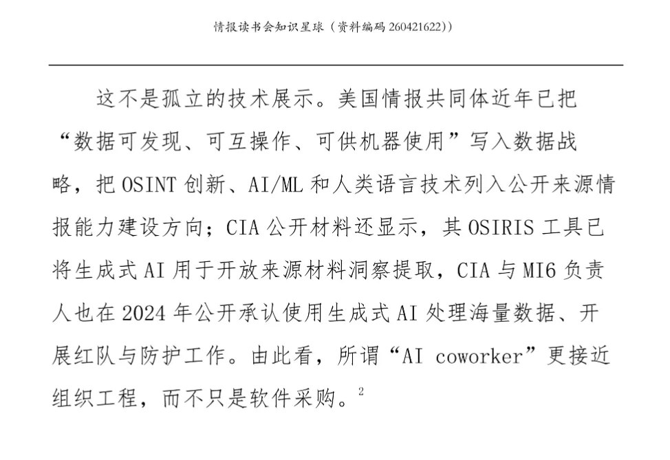 所以,这次真正的分水岭,不是“AI有没有进入情报界”,而是AI从“帮人找材料、写摘要、做辅助”,开始进入“成品报告生成”这个更敏感的位置。