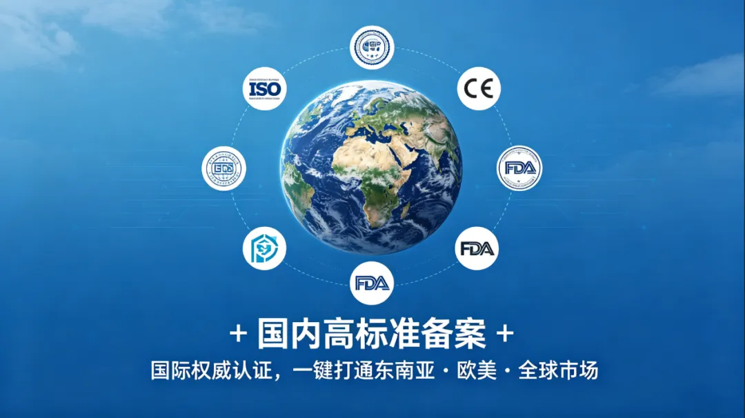 —国际备案:对标 ISO、CE、FDA 等权威标准,完成出口备案与跨境认证,实现全球通行