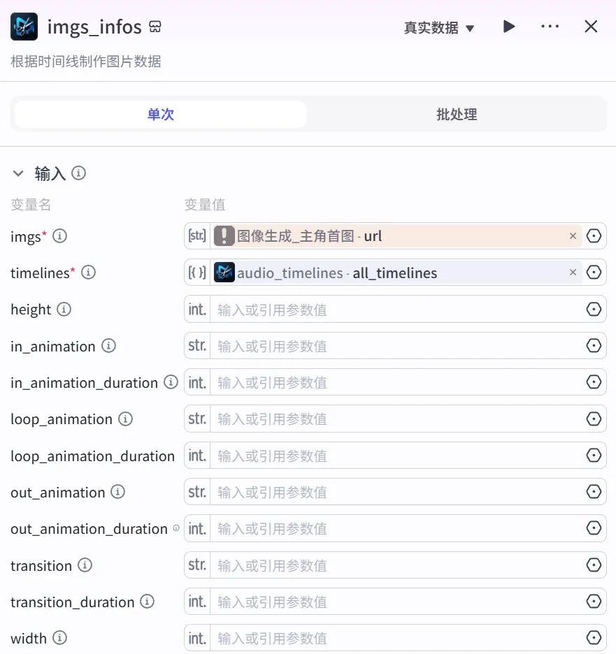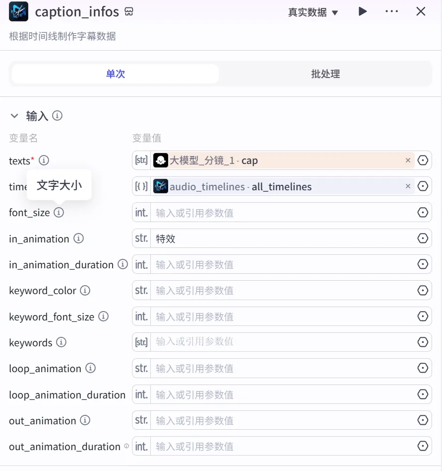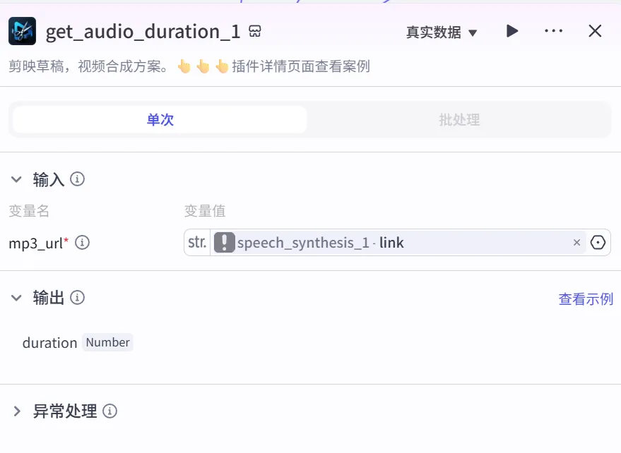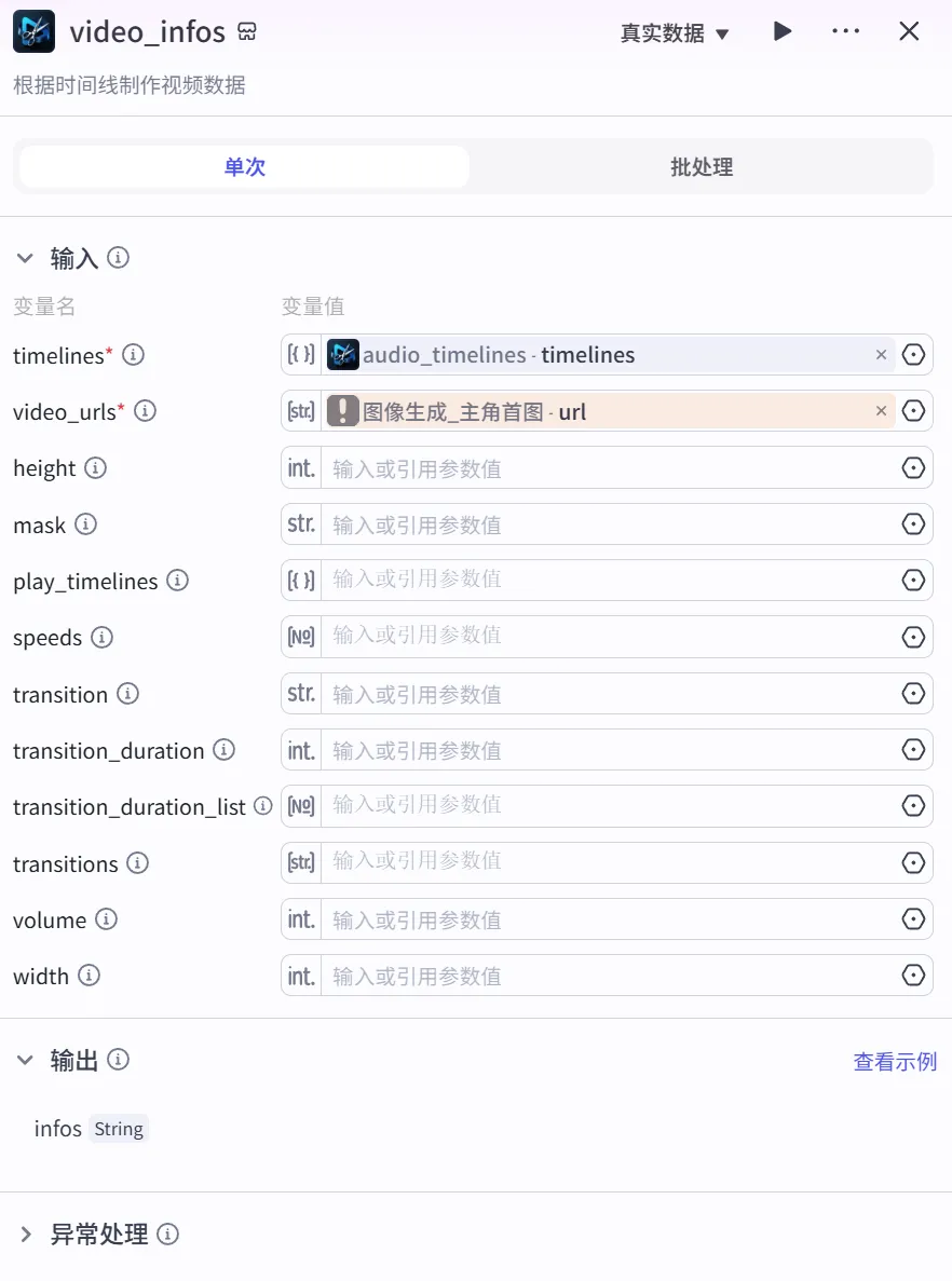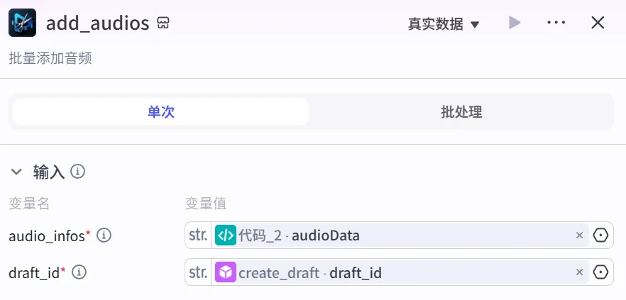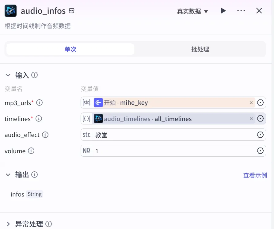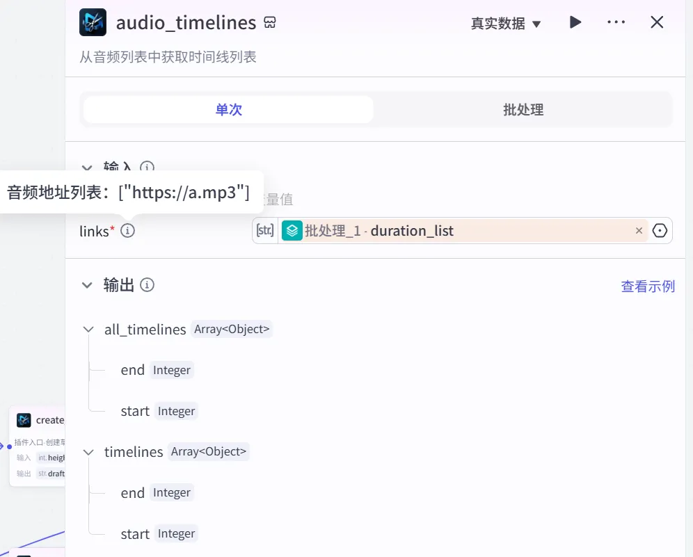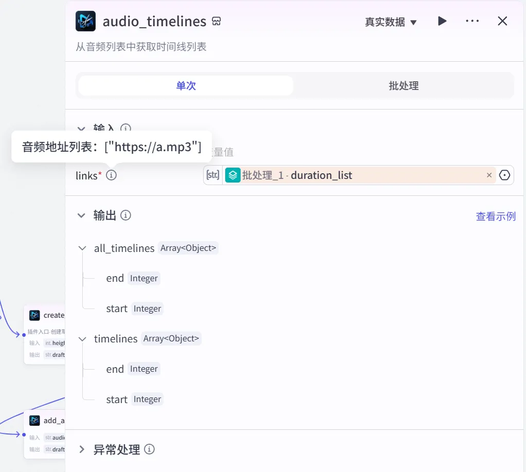 从音频列表中获取时间线列表,这个也是最常用的,往往我们默认是从音频的配音中得到时间线数据,然后在用视频和文案与之相对应。输入的变量要选择音频的链接。