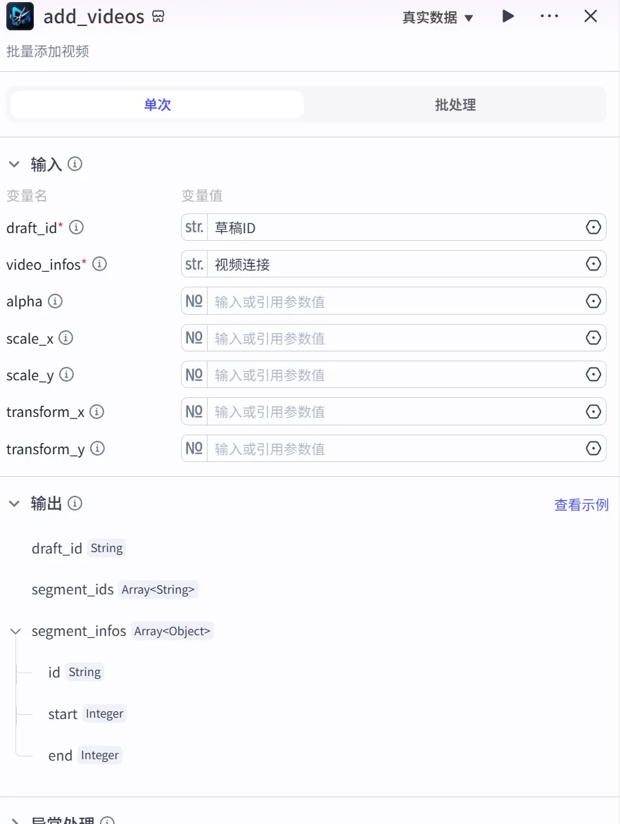 批量添加视频,其他的和上一个节点一样,只是添加视频有相对于音频来说可以设置的功能更多一点,比如透明度,视频位置,视频缩放大小。