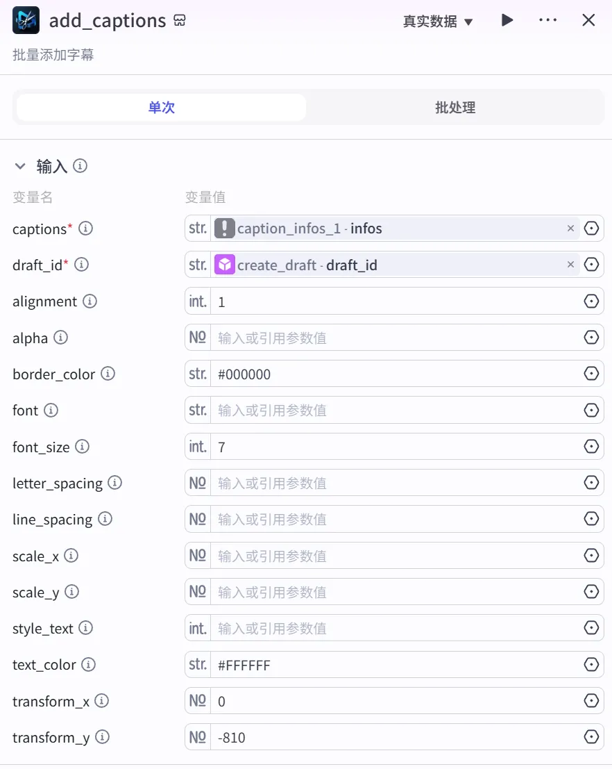 批量添加字幕,相对于添加图片来说,添加字幕有了更多的参数,需要注意的是这里要注意字体大小是不是和之前创建字幕数据的时候的字体大小有冲突。