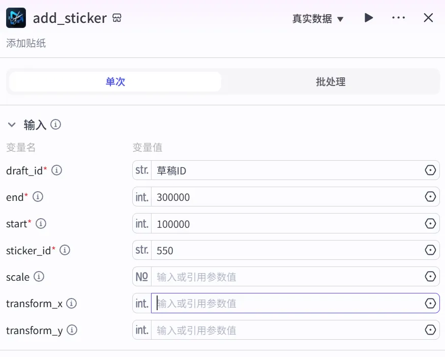 添加贴纸,可以设置开始时间和结束时间,以及贴纸的位置和大小,贴纸ID,从数据生成器search_sticker里面获取