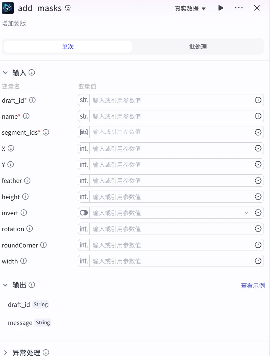 添加蒙版,第一项还是草稿ID,第二个就是蒙蔽的类型,(线性/镜面/圆形/矩形/爱心/星形),第三个就是选择在哪个图片或者那个视频中添加蒙版,剩下的参数就和剪映里面的蒙版设置一样。