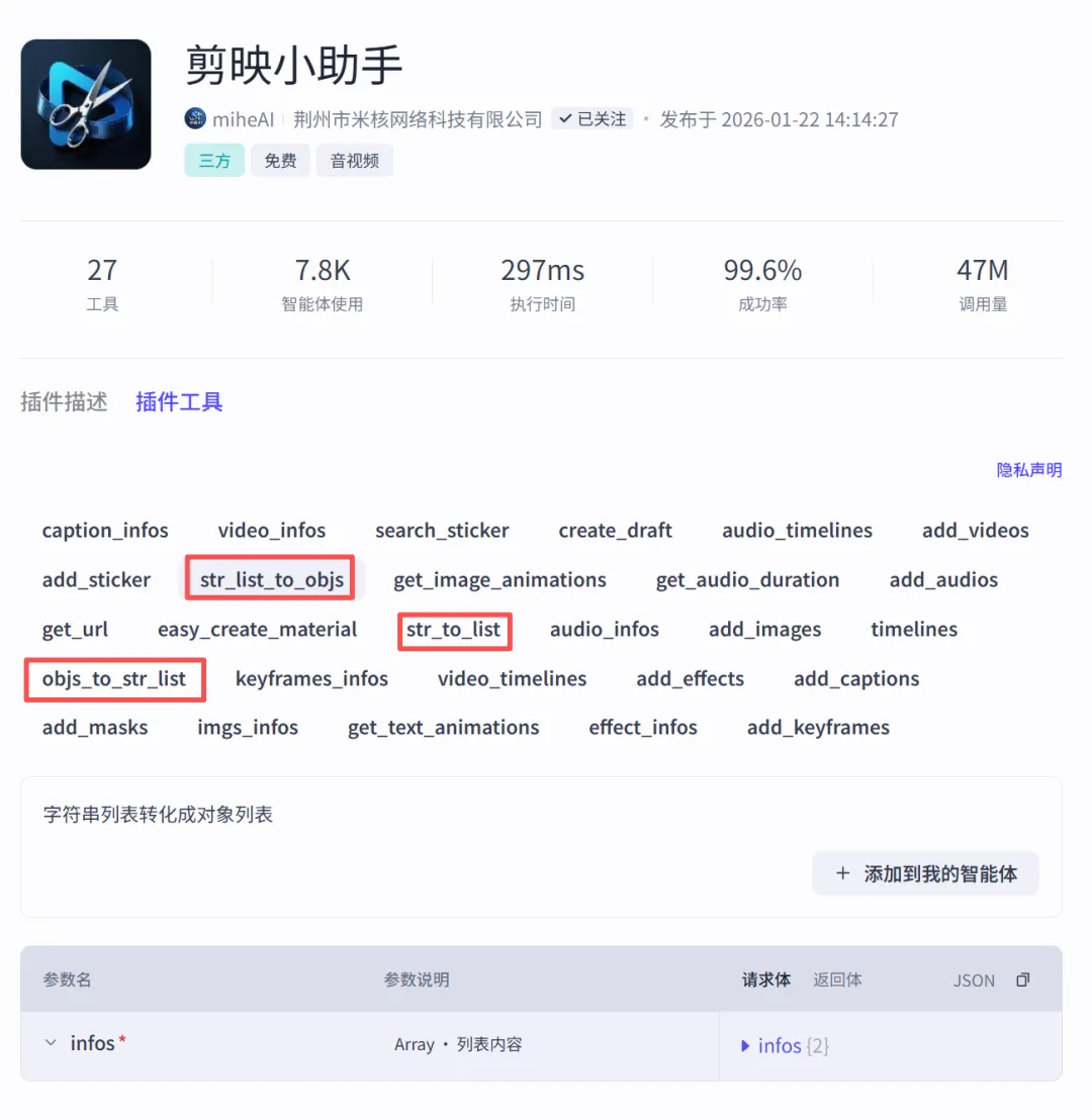 同时我们可以看到这个插件的调用量和成功率是高的离谱的,以后在自己搭建工作流的时候也需要注意,同样功能的插件大多数时候都是以调用量和成功率来选择的。