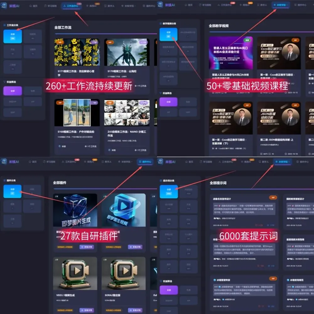 至今平台已经上线了27个原创插件、50节系统化的智能体课程、260+实用的工作流以及将近6000组各行业的实用提示词,并且一直在持续更新。
