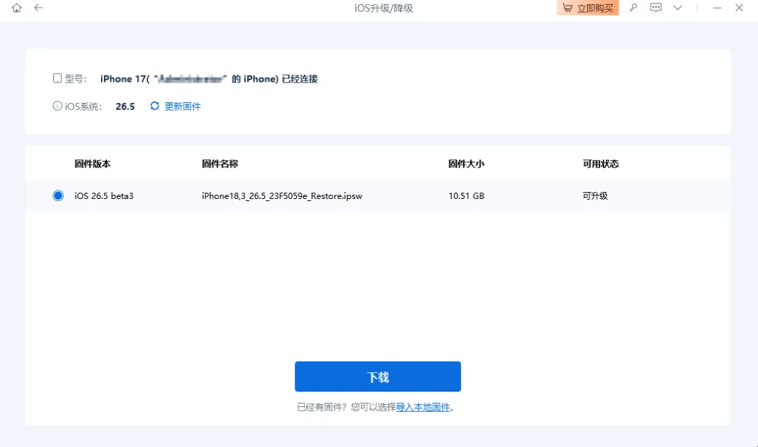 步骤2:选择升级功能,点击【升级】获取可升级iOS固件