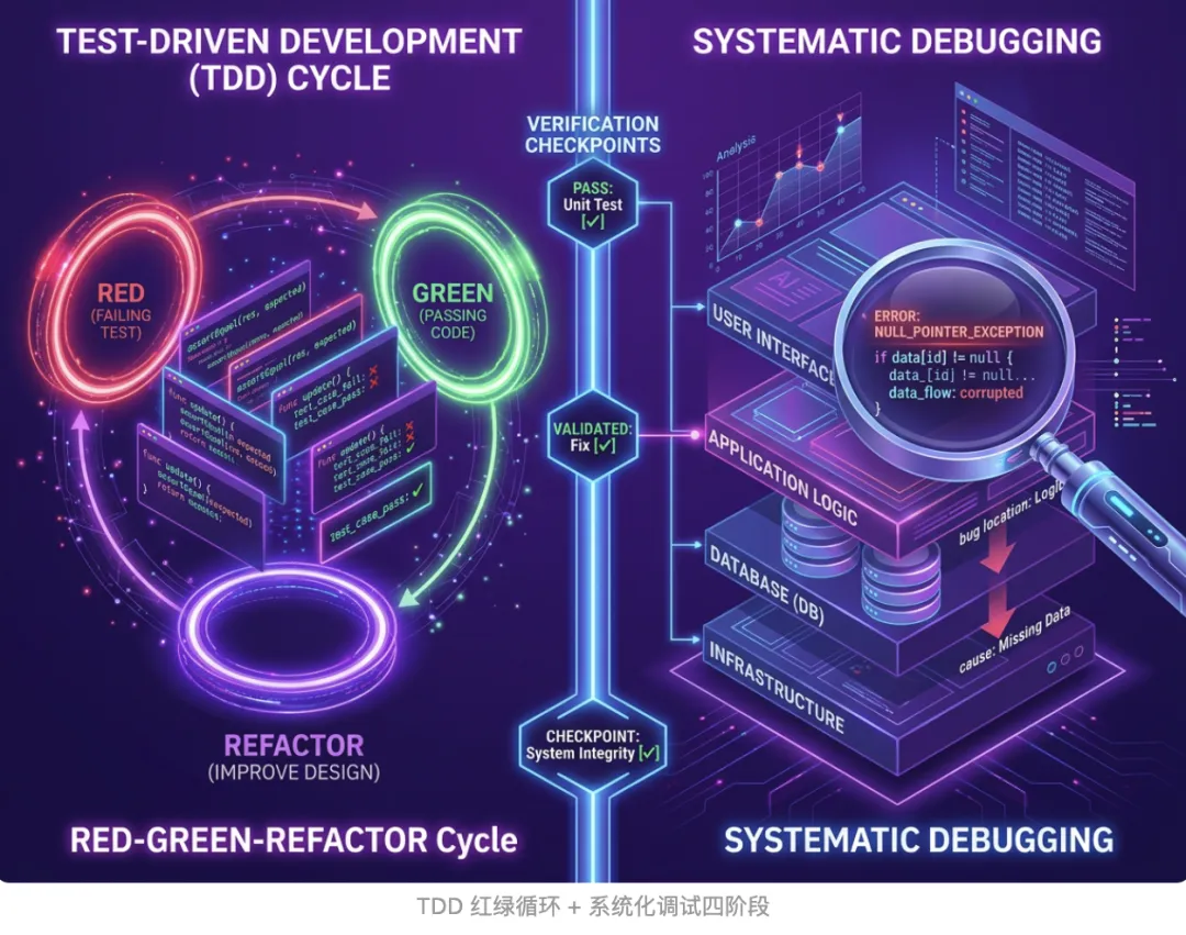 决定用得对不对。TDD、systematic-debugging、verification-before-completion——这些贯穿所有阶段的”不可违反的硬约束”。