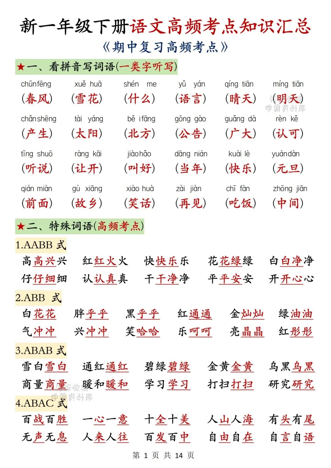 2026春最新版:《一年级语文下册期中高频考点知识汇总》电子版可打印