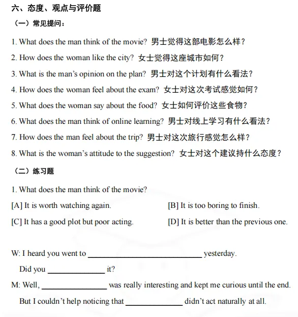 听力训练资源丰富,针对性强。包含地点场景、人物身份、时间数字、原因目的、动作计划、态度观点、细节判断、主旨大意、推理判断九大类核心题型练习。