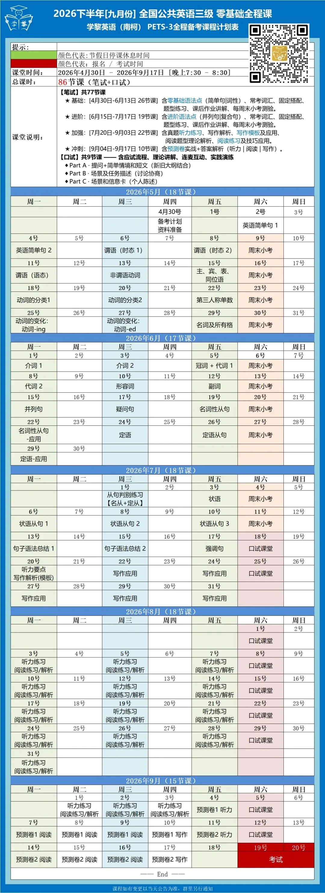 本月30正式开始,课堂持续到9月考试前两三天结束!