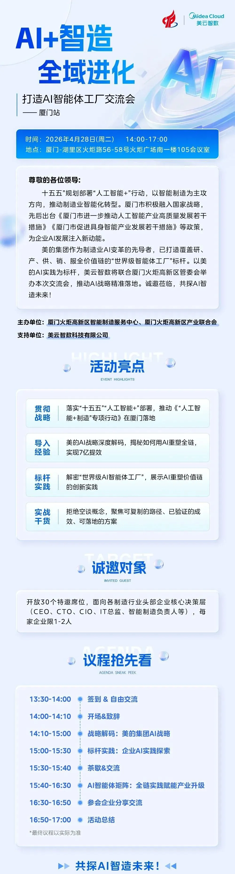 活动报名 | 美的集团“AI智能体工厂”建设交流会