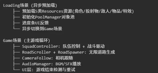 - RoadScroller: 管理 3 个马路段的队列,玩家走过旧路段时回收并在前方生成新段