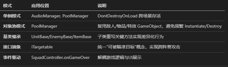 // PoolManager 核心APIPoolManager.Instance.Spawn("EnemyName", parent); // 从池中获取或实例化PoolManager.Instance.Return("EnemyName", obj); // 归还到池中(禁用+回收)PoolManager.Instance.ClearAll(); // 清空池(重新开始时调用)