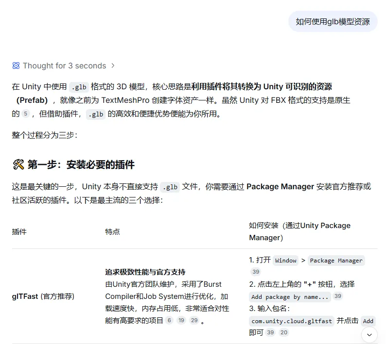既然是3D游戏,就得有模型,这时候需要了解unity中支持的3D模型格式,各种格式的模型之间的区别,还是依靠DeepSeek。这些常规的问题不需要多么强大的语言大模型,大多数语言大模型都能搞定。在DeepSeek的帮助下安装了一些Package