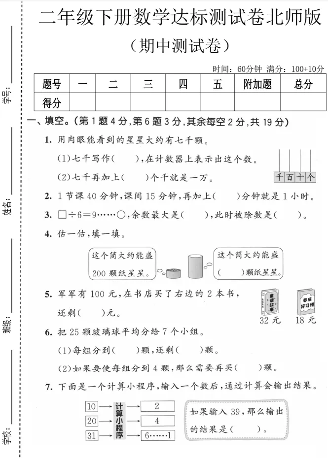 「一年级数学下册北师版期中检测卷」