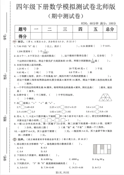 「四年级数学下册北师版期中检测卷」
