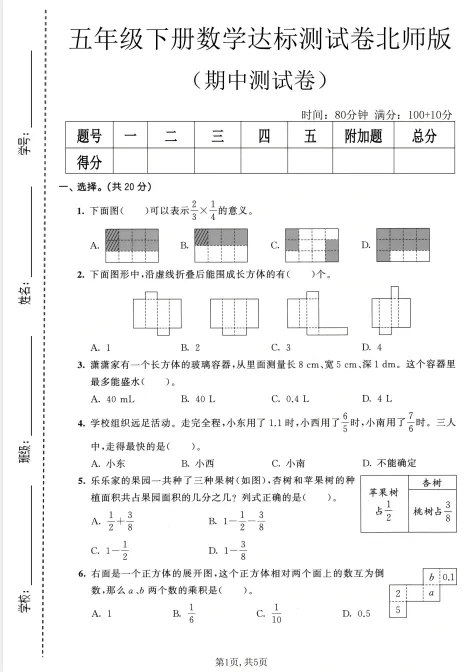 「五年级数学下册北师版期中检测卷」
