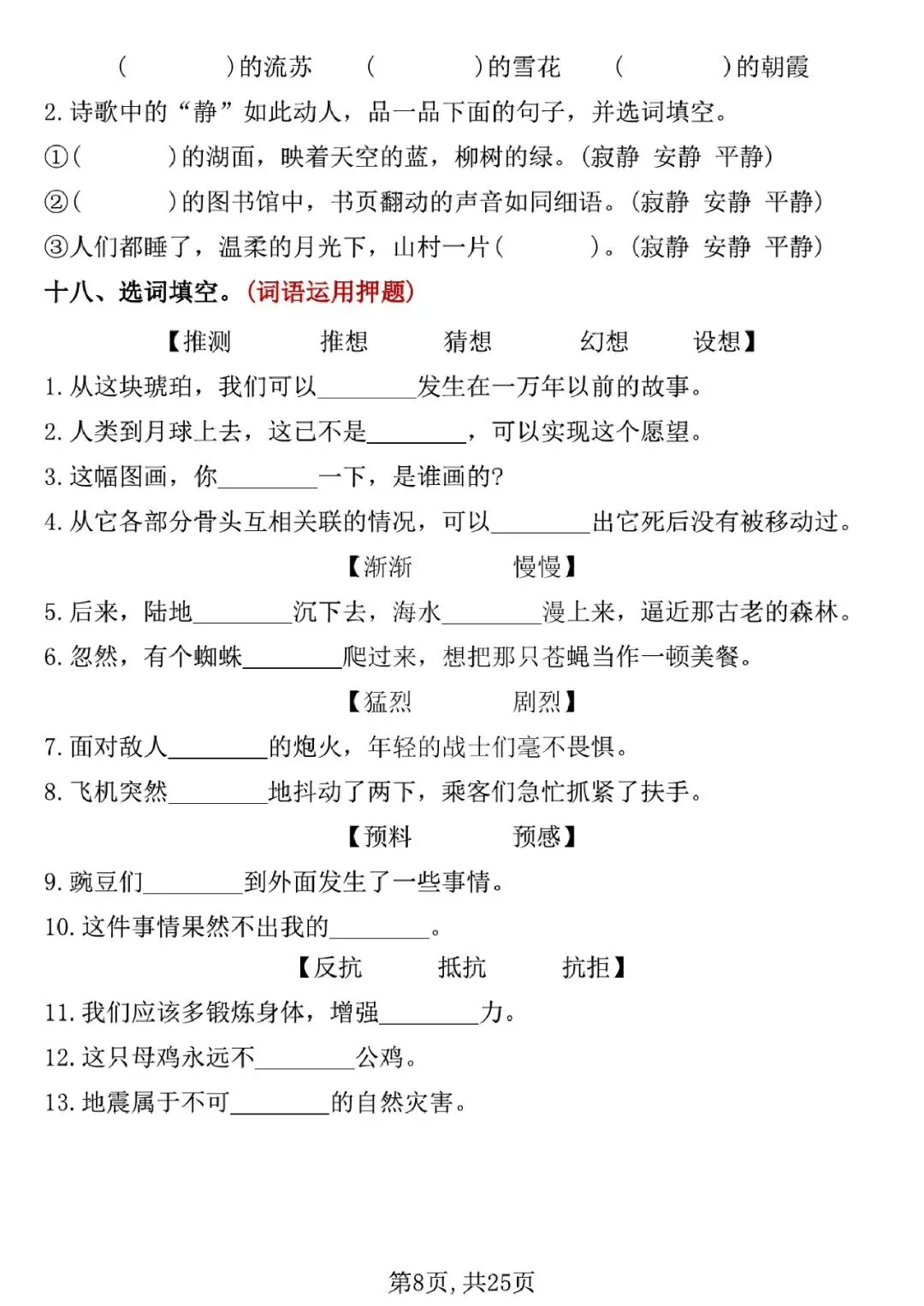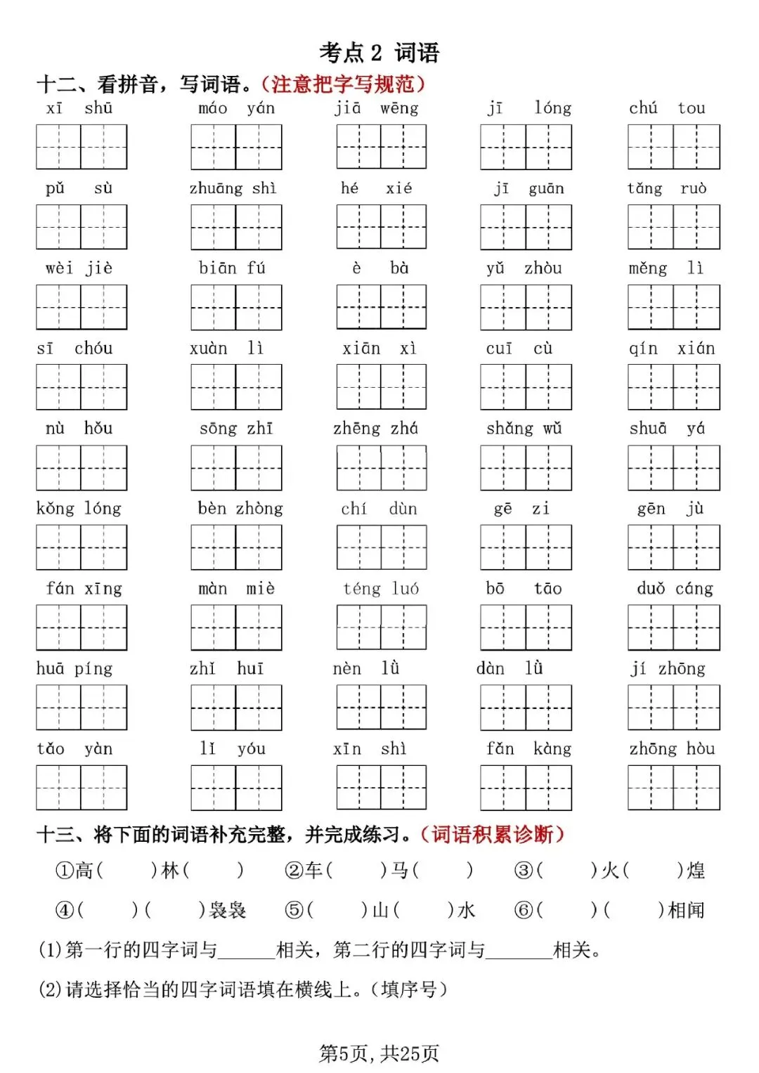 🔔2026春|四年级下册语文【期中复习专项押题版】,共25 页,紧扣教材1—4单元核心考点与课文内容,系统梳理汉字、词语、句子、古诗积累、课文理解、阅读理解六大核心知识点,涵盖看拼音写词语、多音字、形近字、句式改写、课内阅读、课外阅读等全考点,聚焦字词积累、语句运用、阅读理解、古诗默写四大核心能力训练,内容贴合期中考查要求,配套完整答案,便于学生自查巩固、夯实基础,是四年级下册语文期中复习、考前冲刺、基础巩固、专项突破的实用复习资料。有电子版,可下载打印,完整PDF可在本文底部参照下载方式获取。