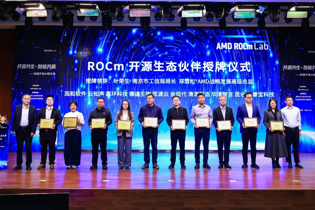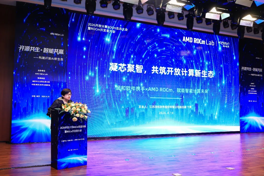 4月18日,2026开放计算ROCm生态大会在中国(南京)软件谷成功举办。本次大会以“开源共生 智能共赢——构建开放AI新生态”为主题,由AMD ROCm Lab主办,南京市工业和信息化局、中国(南京)软件谷管委会共同支持,汇聚省市级领导、生态行业伙伴及高校科研院所等,聚焦ROCm开源软件生态建设与行业智能化升级等关键议题。江苏润和软件股份有限公司(以下简称“润和软件”)作为ROCm开源生态社区的重要生态参与者受邀参会,与ROCm携手共启AI时代的开源生态共建,并做主题分享以及展示基于ROCm开源平台打造的创新产品。这标志着润和软件将坚实的计算底座、AI技术能力与ROCm开源平台相结合,共建开放计算新生态。