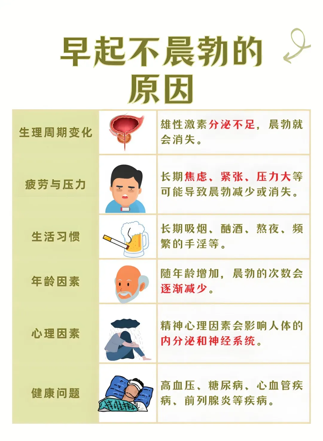 熬夜、失眠、睡眠浅,快速眼动期减少,夜间勃起次数自然下降。补两天觉往往就能恢复。