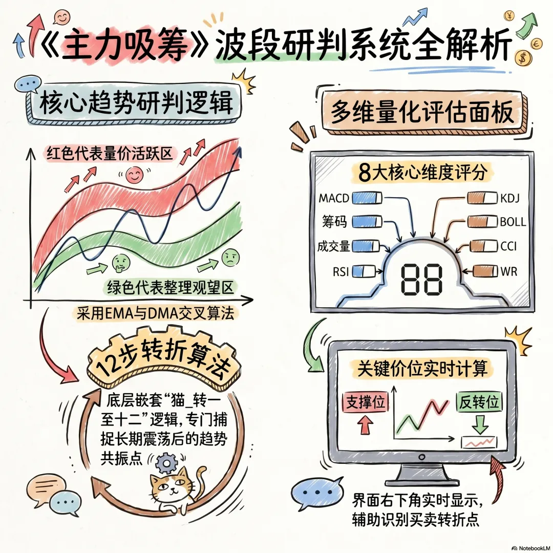 本系统名为《主力吸筹》,是一套专为波段交易设计的动态研判工具。它不仅能通过色彩带识别大环境趋势,更集成了多因子评分系统,旨在解决“趋势何时转折”与“个古成色几何”的痛点。