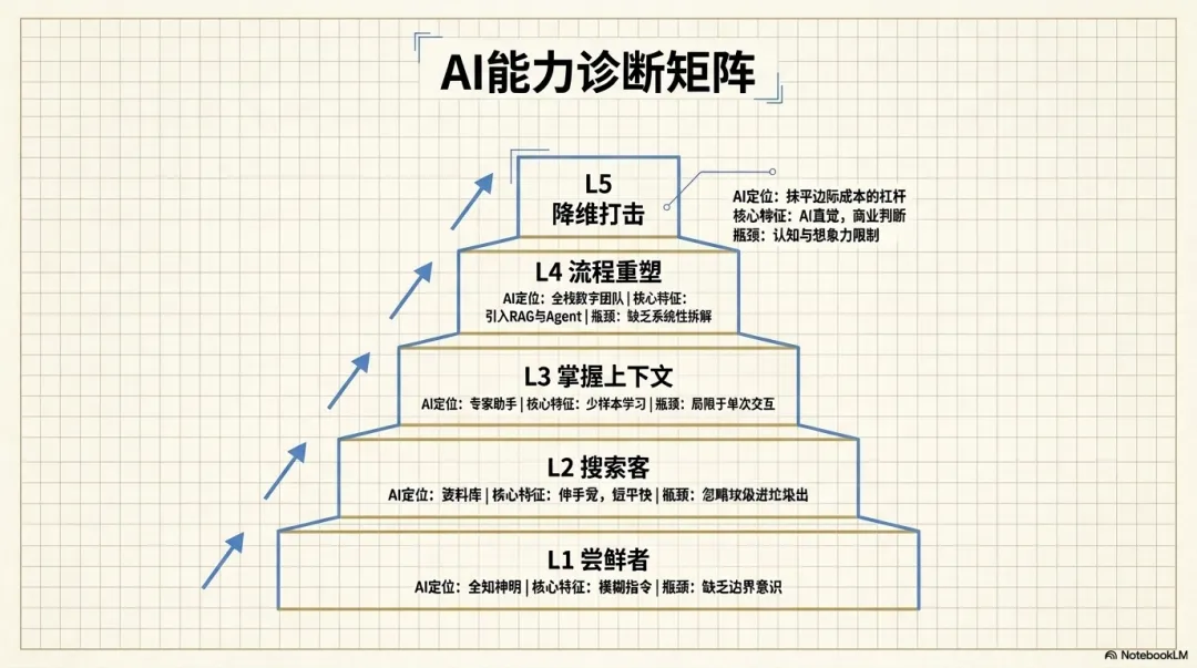 参看了很多AI大佬的论述,再结合我自己使用AI的体会,试着将非技术人员的AI能力划分为5个层级。我们今天就来对号入座,看看自己的AI能力大概在哪一层,又该如何进阶。