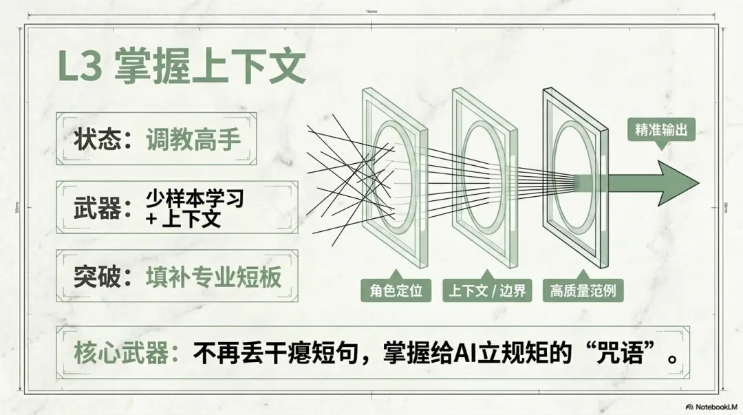 使用AI时不再丢出干瘪的短句,而是掌握了给AI立规矩的“咒语”。你了解不同AI工具的特点,通过给AI投喂几个高质量的范例来纠正它的输出偏好;你会构建清晰的上下文环境,为AI设定特定的专家角色、任务边界和受众目标。
