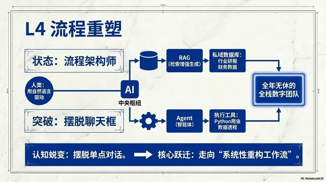 如果说L3是单点突破,那么L4就是全面织网。处于这个层级的你,已经脱离了“聊天框”的束缚,开始思考工作流(Workflow)的系统性重构。