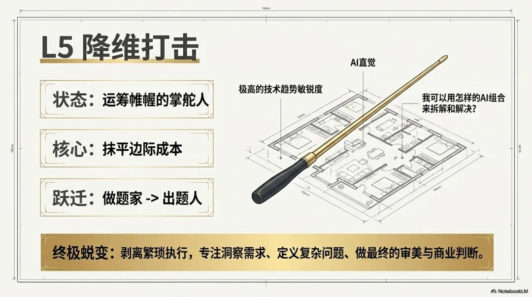 在这一层,具体的工具名称和操作步骤已经不重要了。你拥有了极高的技术趋势敏锐度,并将这种敏锐度转化为“AI直觉”。你全面了解AI的能力边界, 你深知AI的核心商业价值在于“抹平边际成本”。遇到任何复杂项目,你的第一反应不再是“我该怎么做”,而是“我可以用怎样的AI组合来拆解和解决”。