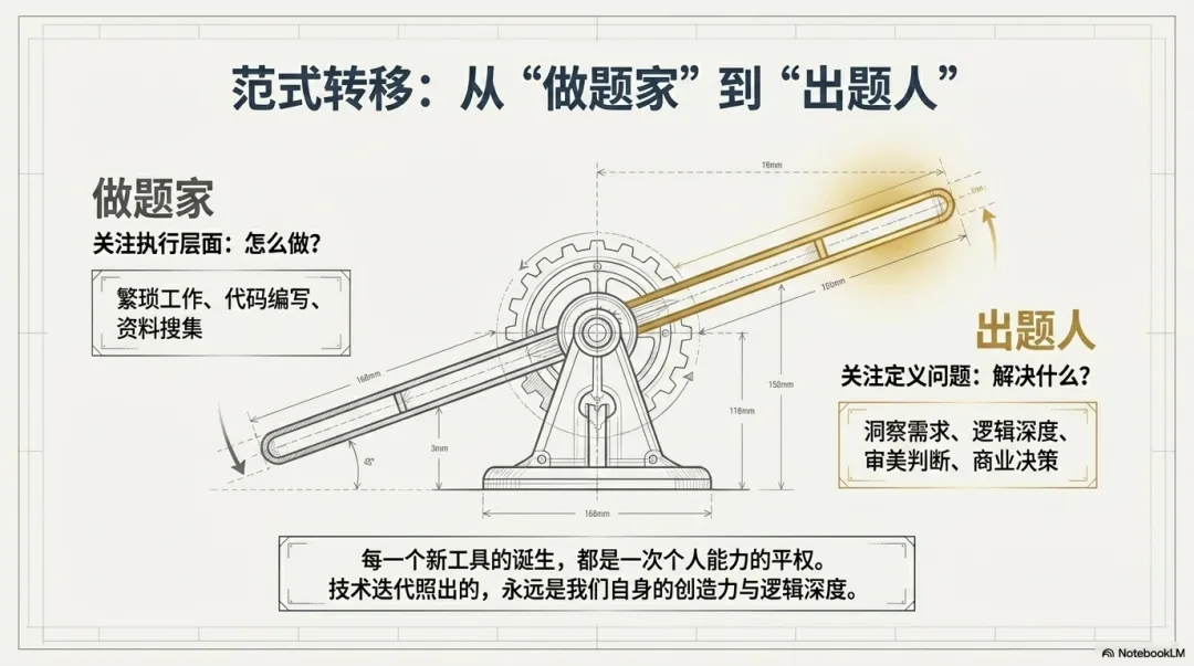 你的核心竞争力,完成了从“做题家”到“出题人”的终极蜕变。你可以将执行层面的繁琐工作全部自然地交给调教好的AI,而自己则专注于洞察需求、定义复杂问题、做最终的审美与商业判断。