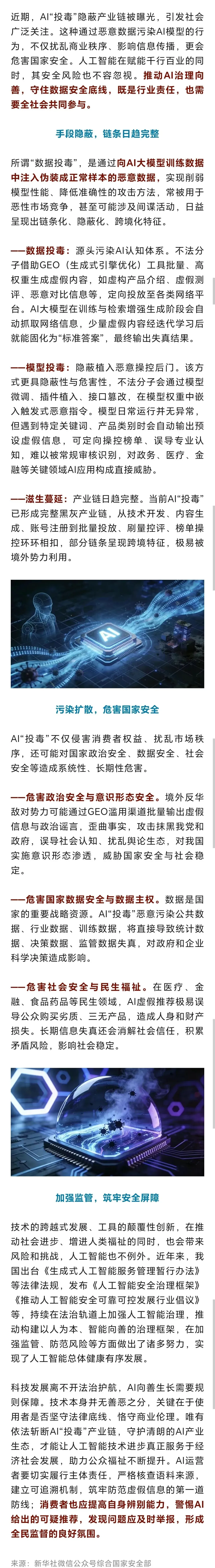 你每天用的AI,可能被“投毒”了 关注阿勒泰市零距离,有您不容错过的精彩! 推荐阅读 百姓身边事丨漫画打卡!解锁阿勒泰市“六维联动”基层治理“心”玩法 摄金山丨春风吻过草原 羔羊衔来新生 您的赞和转发是我们最大的动力! 来源:新华社微信公众号综合国家安全部 责任编辑:阿莱 李新爱 一审:吾兰·哈地肯 二审:田冬 终审:杨晓萌 董红英
