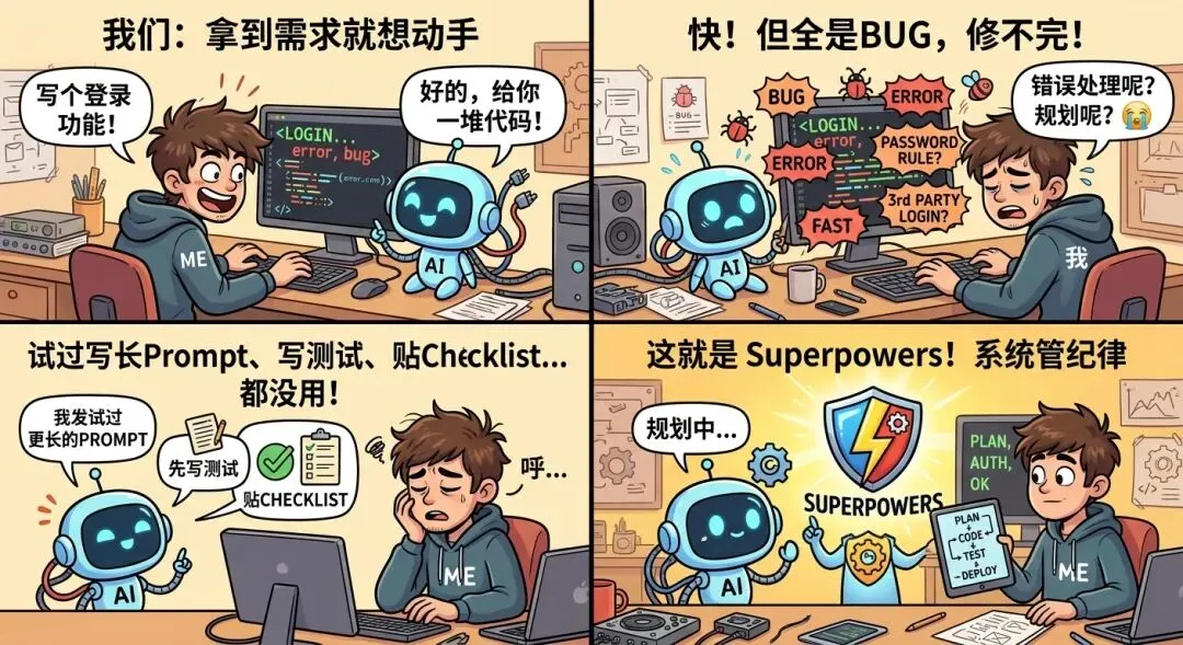 为什么这么火?因为所有人都有同一个痛点:AI 写代码快是快,但没有规划,写到后面全是返工。Superpowers 解决的就是这个问题——它不是教你写代码的,而是替你做规划、替你管纪律的。