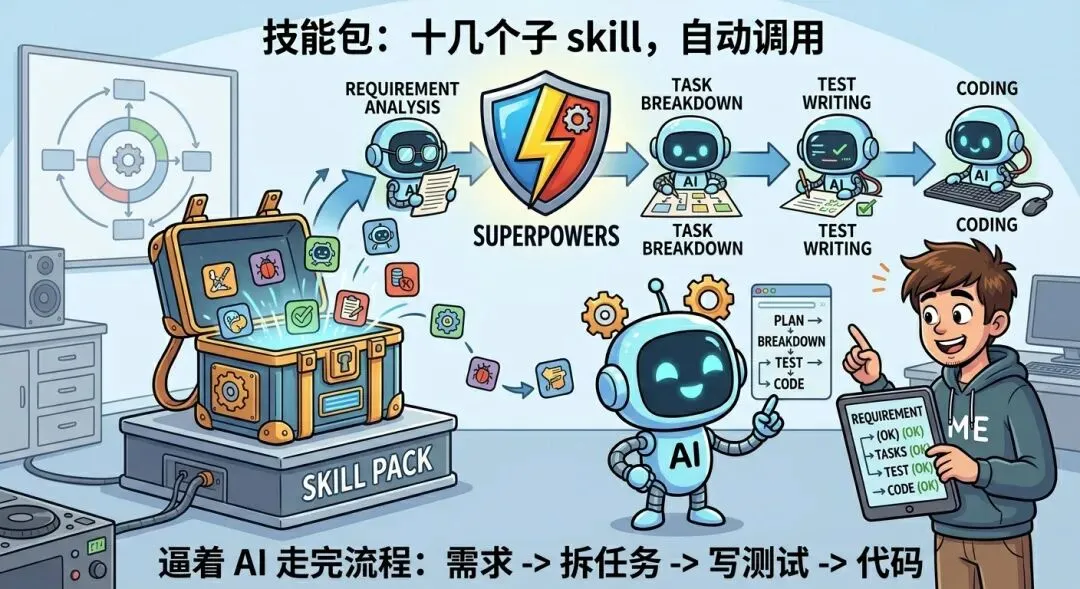 准确说,它是一个技能包,装完之后里面自带十几个子 skill,每个子 skill 管一件事:有的管需求分析,有的管拆任务,有的管写测试,有的管调试。AI 在干活的时候会根据场景自动调用对应的子 skill,不用你操心。