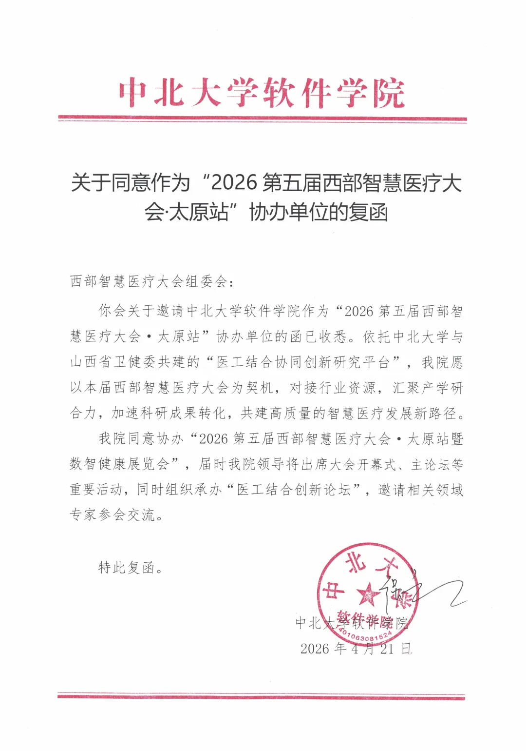 近日,中北大学软件学院正式复函西部智慧医疗大会组委会,同意作为 2026 第五届西部智慧医疗大会・太原站暨数智健康展览会协办单位,并将承办大会重要板块 “医工结合创新论坛”,以产学研协同赋能区域智慧医疗高质量发展。