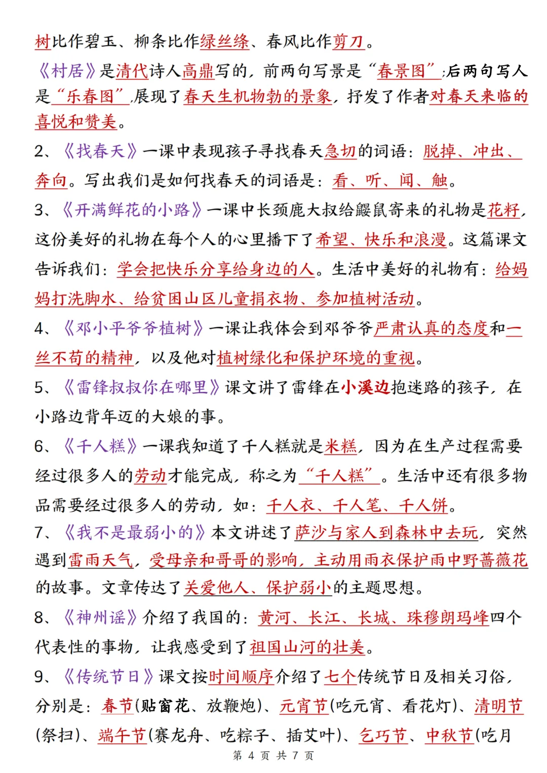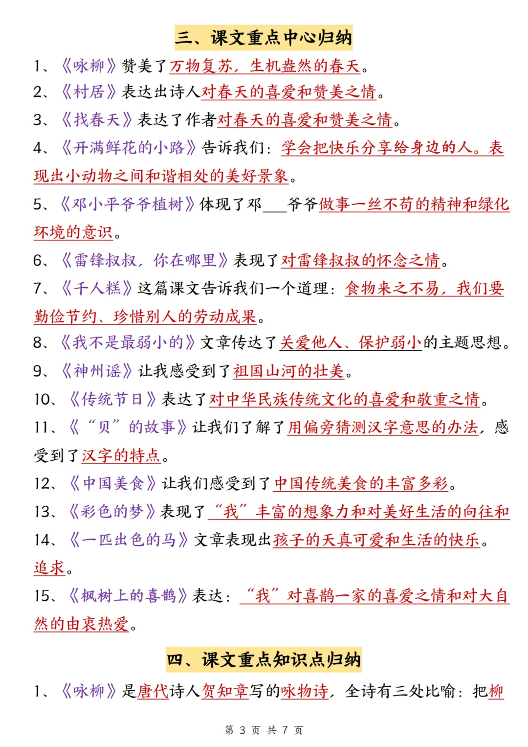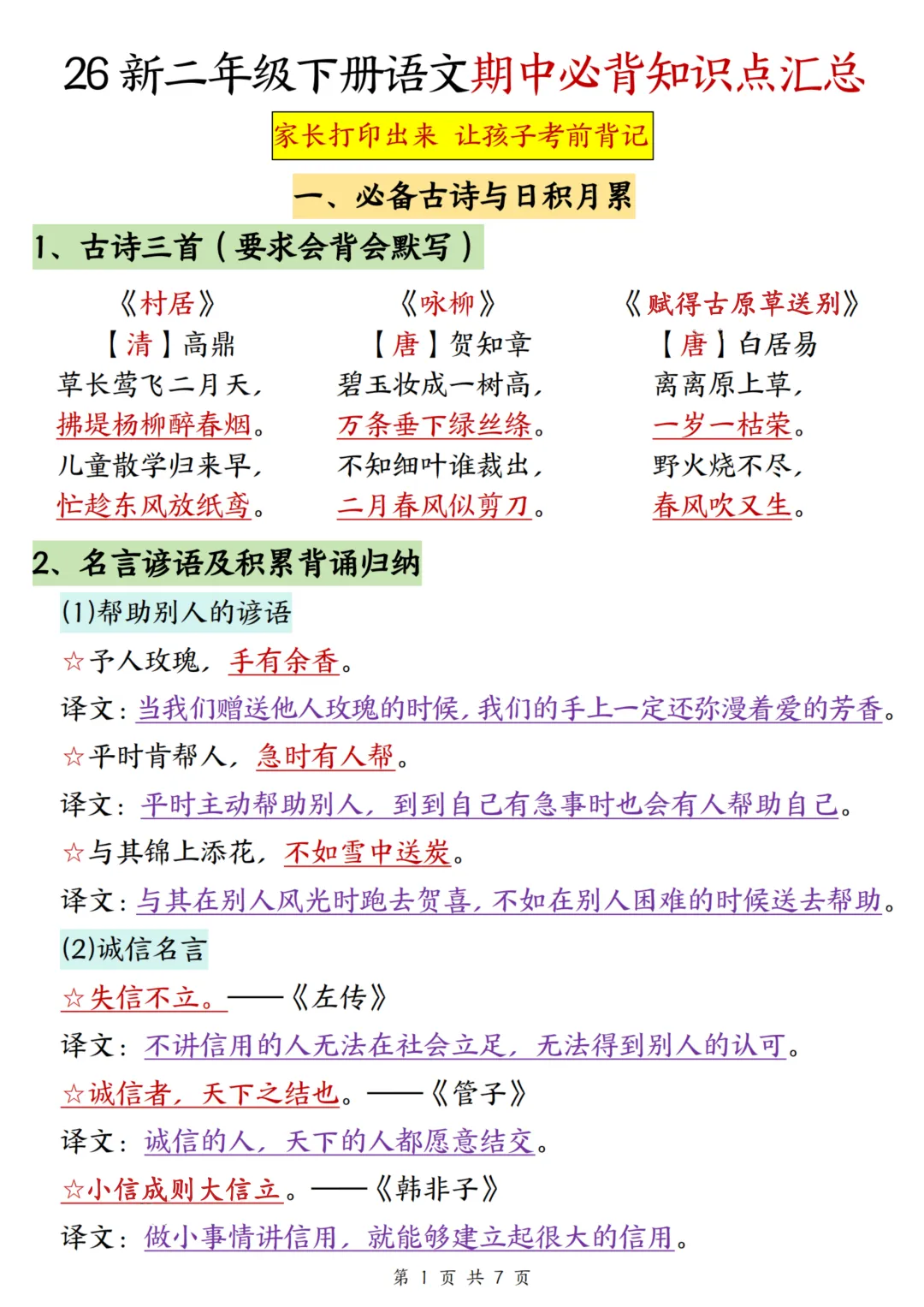 今天为大家分享:二年级下册语文期中复习,最怕知识点零散、抓不住重点。紧扣 2026 春新版教材与新课标要求,系统梳理了全册必背古诗、名言谚语、偏旁部首、课文主旨、人物品质等核心考点,把零散的知识点系统化、条理化,标注了高频必背内容,是期中复习、考前冲刺的核心工具,夯实语文基础,吃透核心考点,稳拿高分。