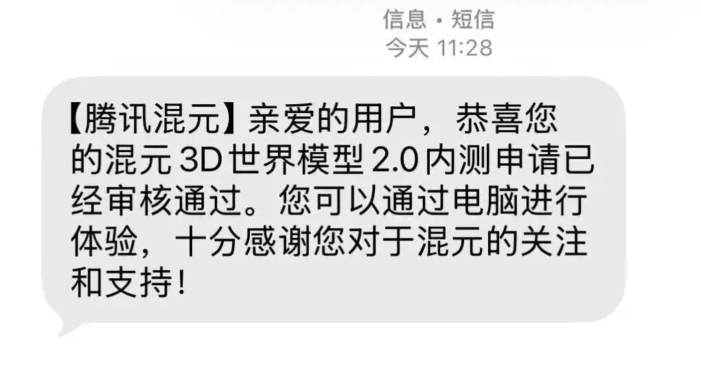 昨天才写完那篇文章,今天一早就收到了腾讯混元的短信——图生场景内测通过了。